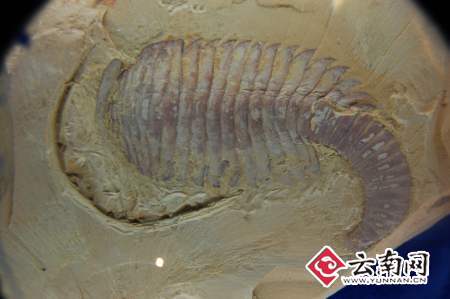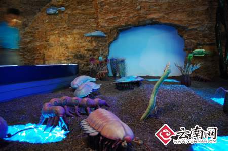 帽天山11公里外,澄江县城西的广场边,一座形似三叶虫的国家地质遗产游人中心展览馆已经建成。踏进展厅,深蓝色的远古海洋复原装饰玻璃墙仿佛把人带入到5亿多年前的海洋生命奇观中,一阶阶标注着地球发展和生命进化历程的“生命之桥”,还原的古生物形态模型、地层剖面构造揭示着生命发展的轨迹,每一步都如同穿越时光隧道跨越了亿万年的变迁。
